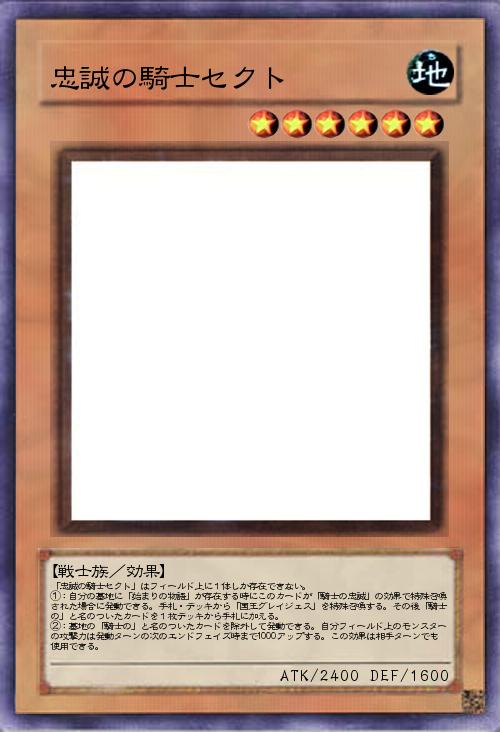 | 「忠誠の騎士セクト」はフィールド上に1体しか存在できない。 ①:自分の墓地に「始まりの物語」が存在する時にこのカードが「騎士の忠誠」の効果で特殊召喚された場合に発動できる。手札・デッキから「国王グレイジェス」を特殊召喚する。その後「騎士の」と名のついたカードを1枚デッキから手札に加える。 ②:墓地の「騎士の」と名のついたカードを除外して発動できる。自分フィールド上のモンスターの攻撃力は発動ターンの次のエンドフェイズ時まで1000アップする。この効果は相手ターンでも使用できる。 | |||