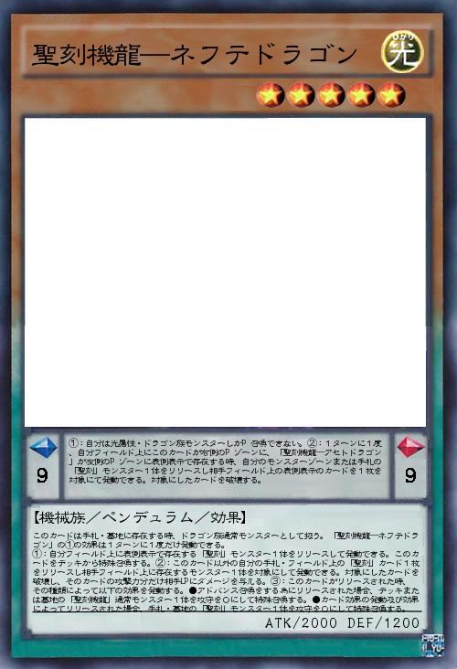 | ①:自分は光属性・ドラゴン族モンスターしかP召喚できない。②:1ターンに1度、自分フィールド上にこのカードが右側のPゾーンに、「聖刻機龍―アセトドラゴン」が左側のPゾーンに表側表示で存在する時、自分のモンスターゾーンまたは手札の「聖刻」モンスター1体をリリースし相手フィールド上の表側表示のカードを1枚を対象にて発動できる。対象にしたカードを破壊する。 | |||