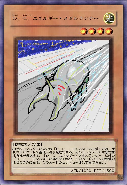 | 相手のモンスターが自分の「D.C.」モンスターに攻撃した時、手札のこのカードを墓地へ送り発動できる。そのモンスターの攻撃対象は自分が選択する。「D.C.エネルギー・メタルランナー」以外の「D.C.」モンスターが存在する場合、このカードの元々の攻撃力は2000になる。このカードのコントロールは変更できない。 | |||