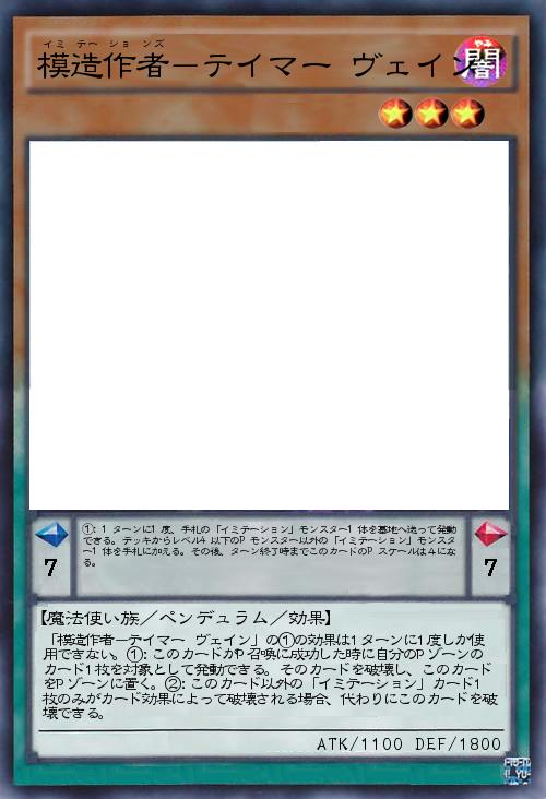 | ①:1ターンに1度、手札の「イミテーション」モンスター1体を墓地へ送って発動できる。デッキからレベル4以下のPモンスター以外の「イミテーション」モンスター1体を手札に加える。その後、ターン終了時までこのカードのPスケールは4になる。 | |||