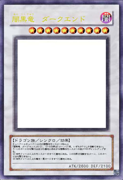 | チューナー+チューナー以外の闇属性モンスター2体以上 「闇黒竜 ダークエンド」の(2)、(3)の効果は1ターンに1度、いずれか1つしか発動できない。 (1)このカードの攻撃力は自分の墓地に存在する闇属性モンスターの数×100ポイントアップする。 (2)相手フィールド上のモンスターをすべて墓地に送る。この効果を発動するターン、このカードは攻撃できない。 (3)相手フィールド上の魔法・罠カードをすべて墓地に送る。 | |||