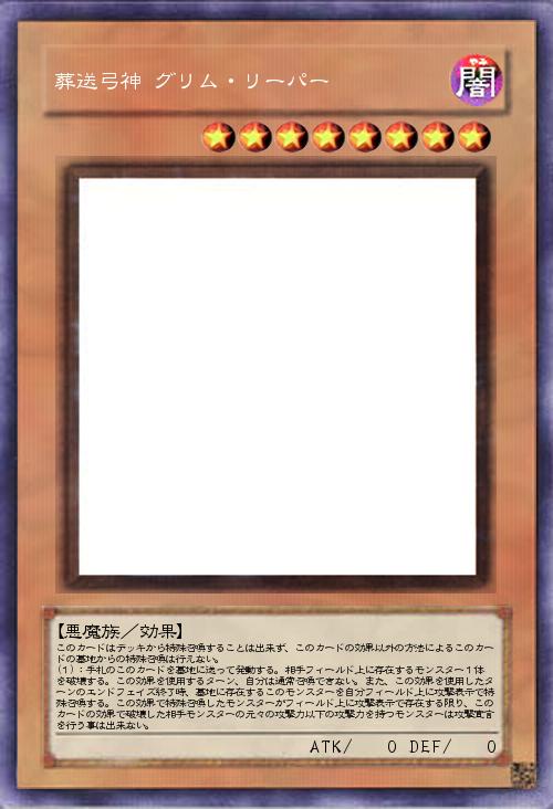 | このカードはデッキから特殊召喚することは出来ず、このカードの効果以外の方法によるこのカードの墓地からの特殊召喚は行えない。 (1):手札のこのカードを墓地に送って発動する。相手フィールド上に存在するモンスター1体を破壊する。この効果を使用するターン、自分は通常召喚できない。また、この効果を使用したターンのエンドフェイズ終了時、墓地に存在するこのモンスターを自分フィールド上に攻撃表示で特殊召喚する。この効果で特殊召喚したモンスターがフィールド上に攻撃表示で存在する限り、このカードの効果で破壊した相手モンスターの元々の攻撃力以下の攻撃力を持つモンスターは攻撃宣言を行う事は出来ない。 | |||