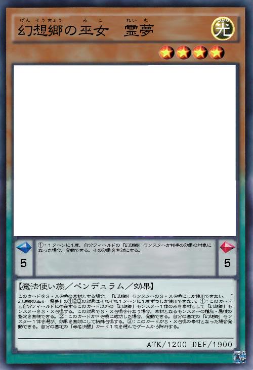 | このカードをS・X召喚の素材とする場合、「幻想郷」モンスターのS・X召喚にしか使用できない。「幻想郷の巫女 霊夢」の①②③の効果はそれぞれ1ターンに1度ずつしか使用できない。①:このカードと自分フィールドに存在するこのカード以外の「幻想郷」モンスター1体のみを素材として「幻想郷」モンスターをS・X召喚する。この効果でS・X召喚を行なう場合、素材となるモンスターの種族・属性の指定を無視できる。②:このカードがP召喚に成功した場合、発動できる。自分の墓地の「幻想郷」モンスター1体を選び、効果を無効にして特殊召喚する。③:このカードがS・X召喚の素材となった場合発動できる。自分の墓地の「命名決闘」カード1枚を選んでゲームから除外する。 | |||