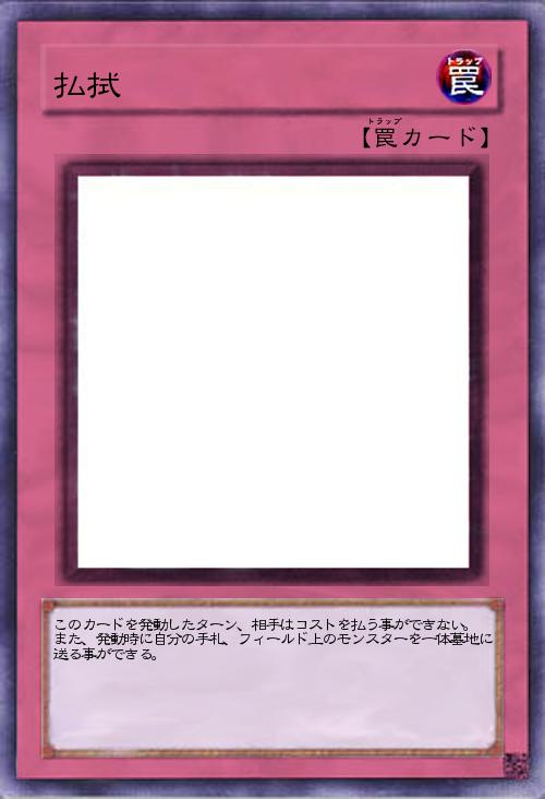 | このカードを発動したターン、相手はコストを払う事ができない。 また、発動時に自分の手札、フィールド上のモンスターを一体墓地に送る事ができる。 | |||