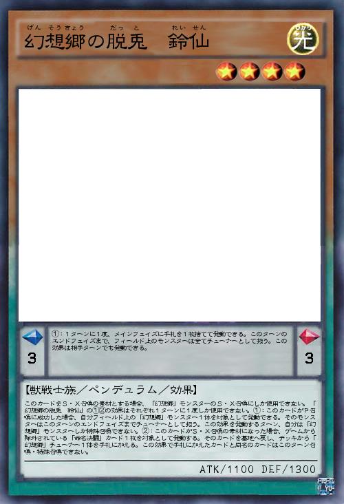 | このカードをS・X召喚の素材とする場合、「幻想郷」モンスターのS・X召喚にしか使用できない。「幻想郷の脱兎 鈴仙」の①②の効果はそれぞれ1ターンに1度しか使用できない。①:このカードがP召喚に成功した場合、自分フィールド上の「幻想郷」モンスター1体を対象として発動できる。そのモンスターはこのターンのエンドフェイズまでチューナーとして扱う。この効果を発動するターン、自分は「幻想郷」モンスターしか特殊召喚できない。②:このカードがS・X召喚の素材になった場合、ゲームから除外されている「命名決闘」カード1枚を対象として発動する。そのカードを墓地へ戻し、デッキから「幻想郷」チューナー1体を手札に加える。この効果で手札に加えたカードと同名のカードはこのターン召喚・特殊召喚できない。 | |||