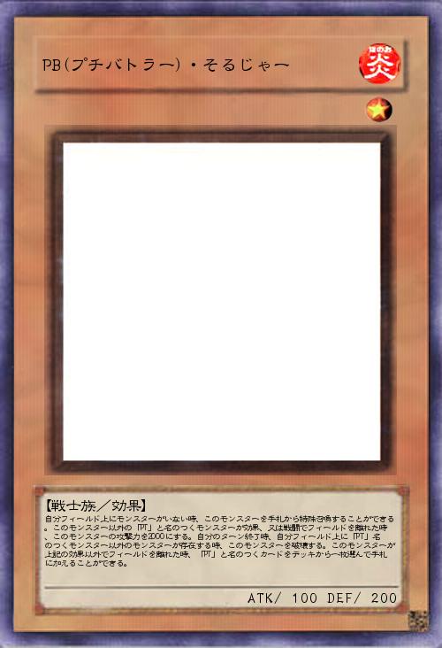 | 自分フィールド上にモンスターがいない時、このモンスターを手札から特殊召喚することができる。このモンスター以外の「PT」と名のつくモンスターが効果、又は戦闘でフィールドを離れた時、このモンスターの攻撃力を2000にする。自分のターン終了時、自分フィールド上に「PT」名のつくモンスター以外のモンスターが存在する時、このモンスターを破壊する。このモンスターが上記の効果以外でフィールドを離れた時、「PT」と名のつくカードをデッキから一枚選んで手札に加えることができる。 | |||
