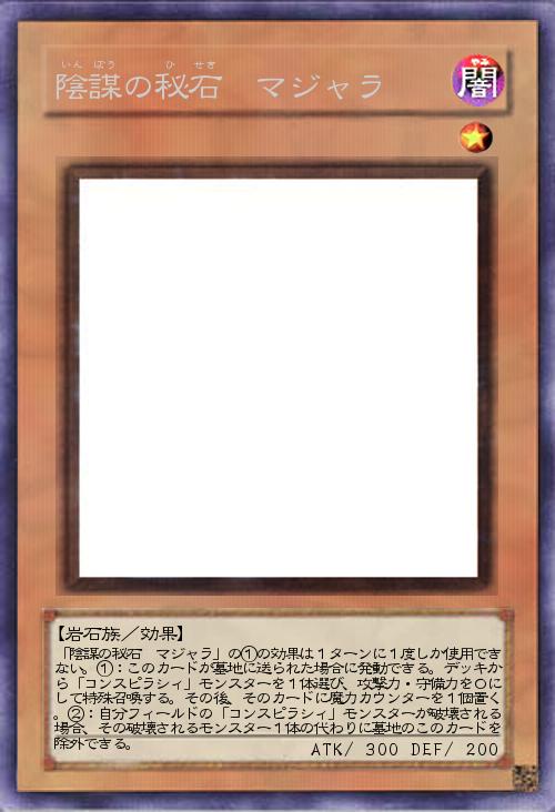 | 「陰謀の秘石 マジャラ」の①の効果は1ターンに1度しか使用できない。①:このカードが墓地に送られた場合に発動できる。デッキから「コンスピラシィ」モンスターを1体選び、攻撃力・守備力を0にして特殊召喚する。その後、そのカードに魔力カウンターを1個置く。②:自分フィールドの「コンスピラシィ」モンスターが破壊される場合、その破壊されるモンスター1体の代わりに墓地のこのカードを除外できる。 | |||