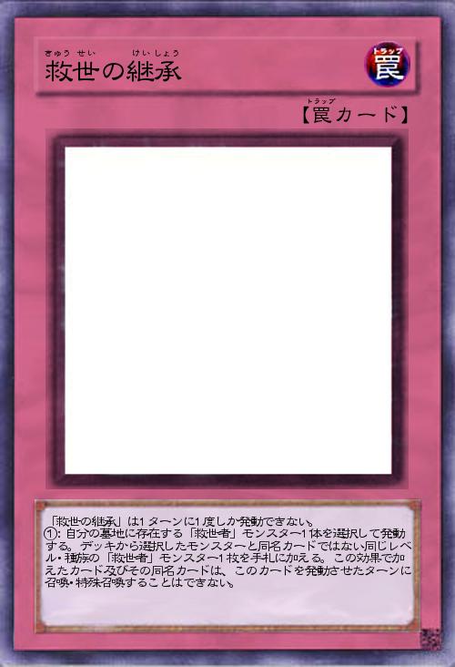 | 「救世の継承」は1ターンに1度しか発動できない。 ①:自分の墓地に存在する「救世者」モンスター1体を選択して発動する。デッキから選択したモンスターと同名カードではない同じレベル・種族の「救世者」モンスター1枚を手札に加える。この効果で加えたカード及びその同名カードは、このカードを発動させたターンに召喚・特殊召喚することはできない。 | |||