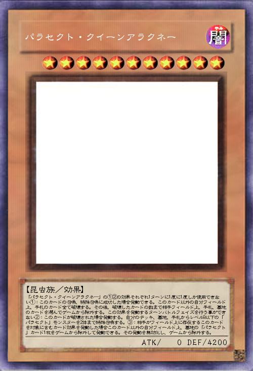 | 「パラセクト・クイーンアラクネ―」の①②の効果それぞれ1ターンに1度に1度しか使用できない①:このカードの召喚、特殊召喚に成功した場合発動できる。このカード以外の自分フィールド上、手札のカード全て破壊する。その後、破壊したカードの数まで相手フィールド上、手札、墓地のカードを選んでゲームから除外する。この効果を発動するターンバトルフェイズを行う事ができない②:このカードが破壊された場合発動する。自分のデッキ、墓地、手札からレベル9以下の「パラセクト」モンスターを2体まで特殊召喚する。③:相手がフィールド上に存在するこのカードを対象に含むカード効果を発動した場合このカード以外の自分フィールド上、墓地の「パラセクト」カード1枚をゲームから除外して発動できる。その発動を無効化し、ゲームから除外する。 | |||