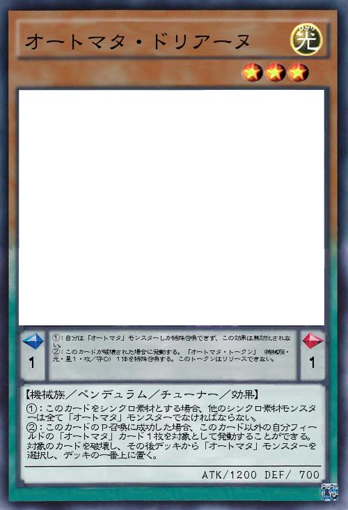 | ①:このカードをシンクロ素材とする場合、他のシンクロ素材モンスターは全て「オートマタ」モンスターでなければならない。 ②:このカードのP召喚に成功した場合、このカード以外の自分フィールドの「オートマタ」カード1枚を対象として発動することができる。対象のカードを破壊し、その後デッキから「オートマタ」モンスターを選択し、デッキの一番上に置く。 | |||