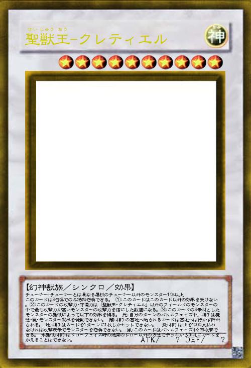 | チューナー+チューナーとは異なる属性のチューナー以外のモンスター1体以上 このカードはS召喚でのみ特殊召喚できる。 ①:このカードはこのカード以外の効果を受けない。②:このカードの攻撃力・守備力は「聖獣王-クレティエル」以外のフィールドのモンスターの中で最も攻撃力が高いモンスターの攻撃力を倍にした数値になる。③:このカードのS素材としたモンスターの属性によって以下の効果を得る。 光:自分のターンのバトルフェイズ中、相手は魔法・罠・モンスター効果を発動できない。 闇:相手の墓地へ送られるカードは墓地へは行かず除外される。 地:相手はカードを1ターンに1枚しかセットできない。 炎:相手はLPを1000支払わなければ攻撃表示でモンスターを召喚できない。 風:このカードはバトルフェイズ中2回攻撃できる。 水属性:相手はドローフェイズ時の通常のドロー以外の方法でデッキから手札にカードを加えることは | |||
