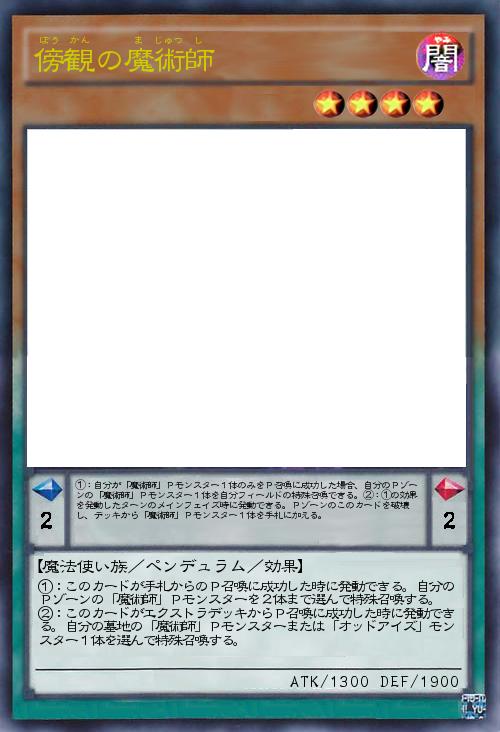 | ①:このカードが手札からのP召喚に成功した時に発動できる。自分のPゾーンの「魔術師」Pモンスターを2体まで選んで特殊召喚する。 ②:このカードがエクストラデッキからP召喚に成功した時に発動できる。自分の墓地の「魔術師」Pモンスターまたは「オッドアイズ」モンスター1体を選んで特殊召喚する。 | |||