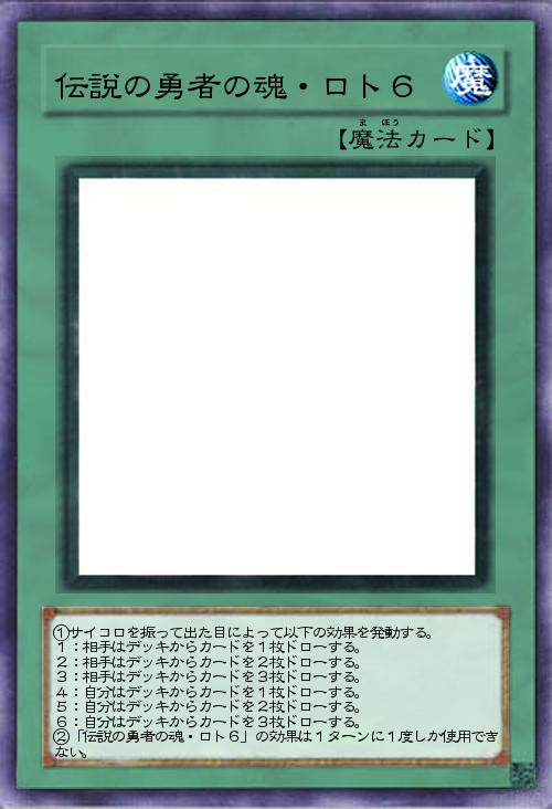 | ①サイコロを振って出た目によって以下の効果を発動する。 1:相手はデッキからカードを1枚ドローする。 2:相手はデッキからカードを2枚ドローする。 3:相手はデッキからカードを3枚ドローする。 4:自分はデッキからカードを1枚ドローする。 5:自分はデッキからカードを2枚ドローする。 6:自分はデッキからカードを3枚ドローする。 ②「伝説の勇者の魂・ロト6」の効果は1ターンに1度しか使用できない。 | |||