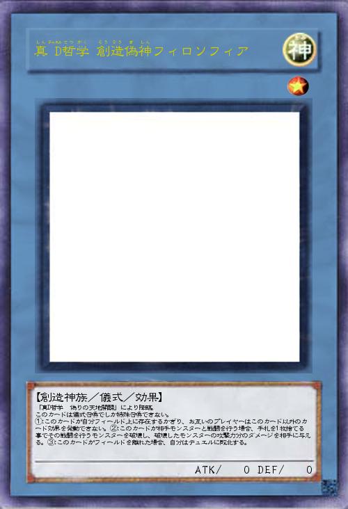 | 「真D哲学 偽りの天地開闢」により降臨。 このカードは儀式召喚でしか特殊召喚できない。 ①:このカードが自分フィールド上に存在するかぎり、お互いのプレイヤーはこのカード以外のカード効果を発動できない。②:このカードが相手モンスターと戦闘を行う場合、手札を1枚捨てる事でその戦闘を行うモンスターを破壊し、破壊したモンスターの攻撃力分のダメージを相手に与える。③:このカードがフィールドを離れた場合、自分はデュエルに敗北する。 | |||
