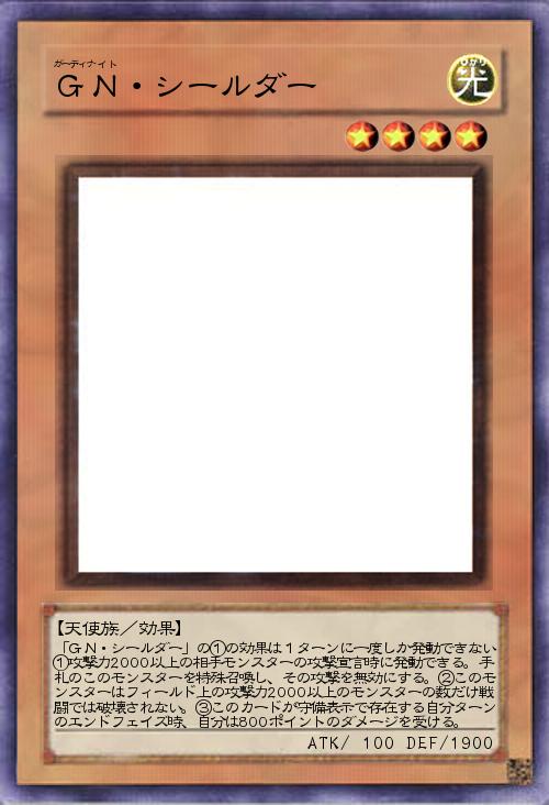 | 「GN・シールダー」の①の効果は1ターンに一度しか発動できない①攻撃力2000以上の相手モンスターの攻撃宣言時に発動できる。手札のこのモンスターを特殊召喚し、その攻撃を無効にする。②このモンスターはフィールド上の攻撃力2000以上のモンスターの数だけ戦闘では破壊されない。③このカードが守備表示で存在する自分ターンのエンドフェイズ時、自分は800ポイントのダメージを受ける。 | |||