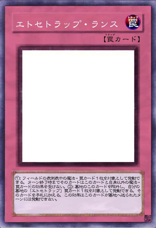 | ①:フィールドの表側表示の魔法・罠カード1枚を対象として発動できる。ターン終了時までそのカードはこのカードと自身以外の魔法・罠カードの効果を受けない。②:墓地のこのカードを除外し、自分の墓地の「エトセトラップ」罠カード1枚を対象として発動できる。そのカードを手札に加える。この効果はこのカードが墓地へ送られたターンには発動できない。 | |||