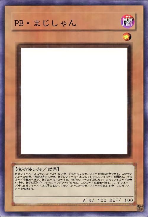 | 自分フィールド上にモンスターがいない時、手札からこのモンスターを特殊召喚できる。このモンスターが召喚、特殊召喚された時、相手のフィールド上にセットされているカードを選択し、そのカードを墓地へ送り、相手は一枚ドローする。相手のフィールド上にセットされているカードが無い場合、相手に800ポイントのライフダメージを与え、このカードを墓地へ送る。エンドフェイズ時に自分フィールド上にPBと名のつくモンスター以外のモンスターが存在する時、このモンスターを破壊する。 | |||