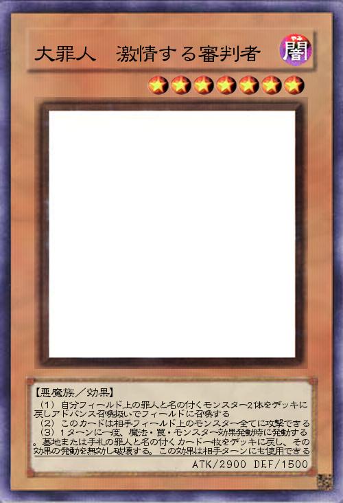 | (1)自分フィールド上の罪人と名の付くモンスター2体をデッキに戻しアドバンス召喚扱いでフィールドに召喚する (2)このカードは相手フィールド上のモンスター全てに攻撃できる (3)1ターンに一度、魔法・罠・モンスター効果発動時に発動する。墓地または手札の罪人と名の付くカード一枚をデッキに戻し、その効果の発動を無効し破壊する。この効果は相手ターンにも使用できる | |||