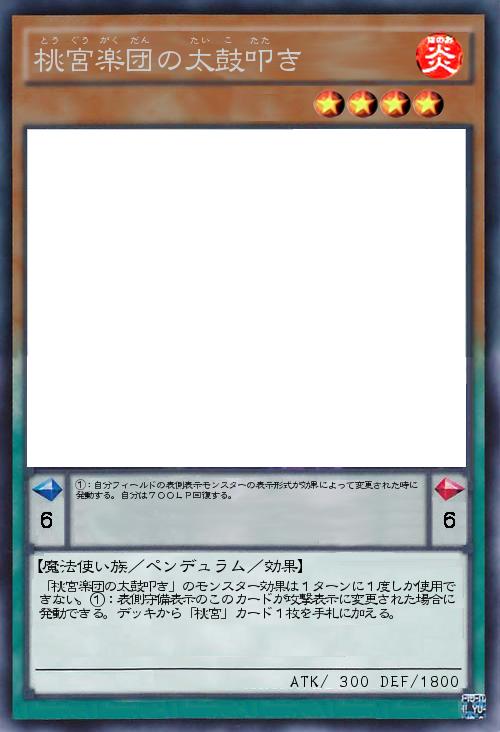 | 「桃宮楽団の太鼓叩き」のモンスター効果は1ターンに1度しか使用できない。①:表側守備表示のこのカードが攻撃表示に変更された場合に発動できる。デッキから「桃宮」カード1枚を手札に加える。 | |||