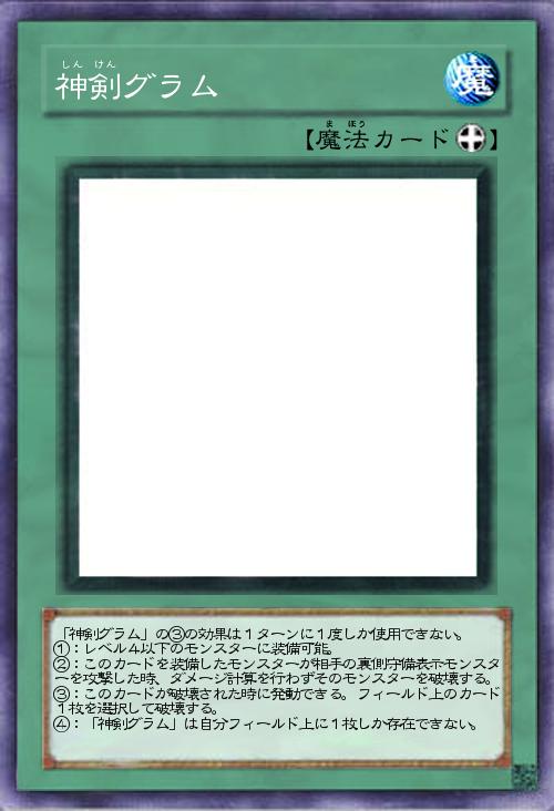 | 「神剣グラム」の③の効果は1ターンに1度しか使用できない。 ①:レベル4以下のモンスターに装備可能。 ②:このカードを装備したモンスターが相手の裏側守備表示モンスターを攻撃した時、ダメージ計算を行わずそのモンスターを破壊する。 ③:このカードが破壊された時に発動できる。フィールド上のカード1枚を選択して破壊する。 ④:「神剣グラム」は自分フィールド上に1枚しか存在できない。 | |||