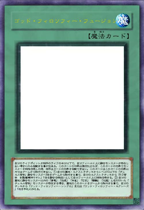 | 自分のライフポイントが相手のライフの半分以下で、自分フィールド上に融合モンスターが存在しない場合にのみ発動する事が出来る。このカードの効果は無効化されず、このカードの効果でモンスターを特殊召喚した時、相手はカードの効果を発動できない。このカードはこのカードの効果以外ではゲームから除外できない。①:自分の墓地・エクストラデッキからレベル10以下の「デュエル哲学」融合モンスター3体をゲームから除外する事で、自分のエクストラデッキから「N:D哲学 剣聖魔導神マギト」1体を融合召喚扱いとして自分フィールド上に特殊召喚する。②:自分の墓地に融合モンスター以外の「青竜」「白虎」「朱雀」「玄武」「麒麟」「光龍」と名の付いた「デュエル哲学」モンスターが存在する場合、墓地のこのカードをゲームから除外する事で、自分のデッキから「ゴッド・フィロソフィー・シンクロ」または「ゴッド・フィロソフィー・エクシーズ」1 | |||