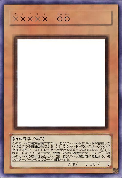 | このカードは通常召喚できない。自分フィールドにカードが存在しない場合にのみ特殊召喚できる。①:このカードがモンスターゾーンに存在する限り、コントローラーが受けるダメージは0になる。②:このカードはリリースできず、戦闘・効果で破壊されず、このカード以外のカードの効果を受けない。③:自分ターン開始時に発動する。モンスターゾーンのこのカードを除外する。 | |||