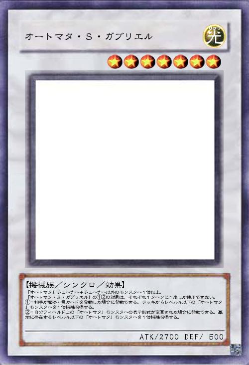 | 「オートマタ」チューナー+チューナー以外のモンスター1体以上。 「オートマタ・S・ガブリエル」の①②の効果は、それぞれ1ターンに1度しか使用できない。 ①:相手が魔法・罠カードを発動した場合に発動できる。デッキからレベル4以下の「オートマタ」モンスターを1体特殊召喚する。 ②:自分フィールド上の「オートマタ」モンスターの表示形式が変更された場合に発動できる。墓地に存在するレベル4以下の「オートマタ」モンスターを1体特殊召喚する。 | |||