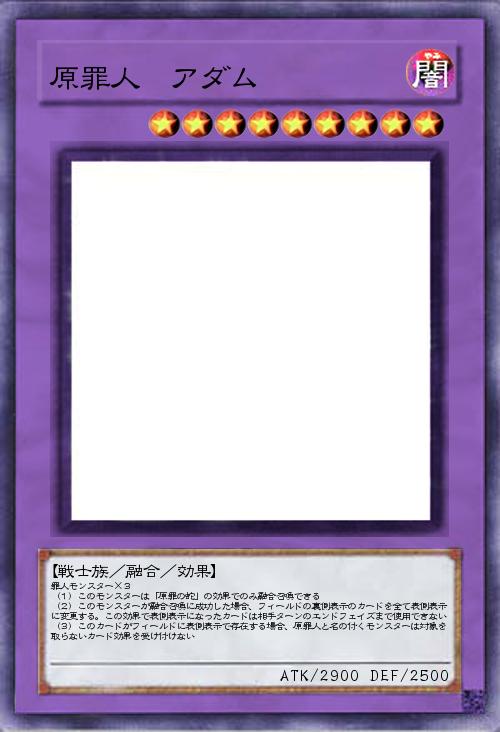 | 罪人モンスター×3 (1)このモンスターは「原罪の蛇」の効果でのみ融合召喚できる (2)このモンスターが融合召喚に成功した場合、フィールドの裏側表示のカードを全て表側表示に変更する。この効果で表側表示になったカードは相手ターンのエンドフェイズまで使用できない (3)このカードがフィールドに表側表示で存在する場合、原罪人と名の付くモンスターは対象を取らないカード効果を受け付けない | |||