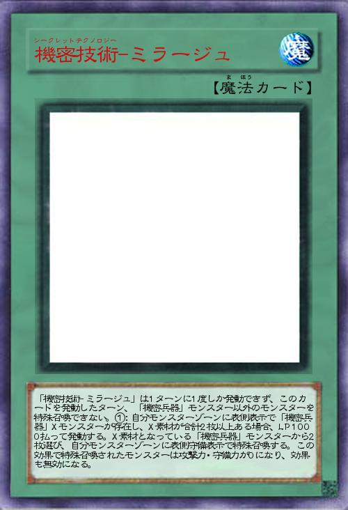 | 「機密技術-ミラージュ」は1ターンに1度しか発動できず、このカードを発動したターン、「機密兵器」モンスター以外のモンスターを特殊召喚できない。①:自分モンスターゾーンに表側表示で「機密兵器」Xモンスターが存在し、X素材が合計2枚以上ある場合、LP1000払って発動する。X素材となっている「機密兵器」モンスターから2枚選び、自分モンスターゾーンに表側守備表示で特殊召喚する。この効果で特殊召喚されたモンスターは攻撃力・守備力が0になり、効果も無効になる。 | |||
