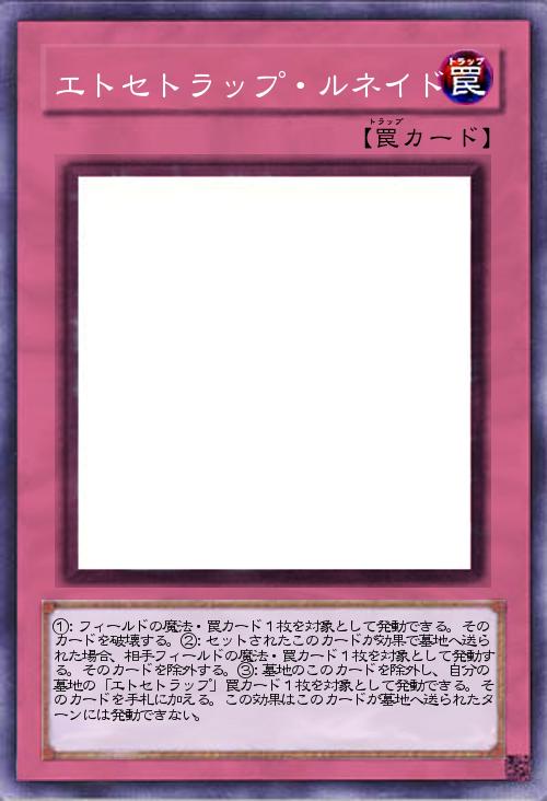 | ①:フィールドの魔法・罠カード1枚を対象として発動できる。そのカードを破壊する。②:セットされたこのカードが効果で墓地へ送られた場合、相手フィールドの魔法・罠カード1枚を対象として発動する。そのカードを除外する。③:墓地のこのカードを除外し、自分の墓地の「エトセトラップ」罠カード1枚を対象として発動できる。そのカードを手札に加える。この効果はこのカードが墓地へ送られたターンには発動できない。 | |||