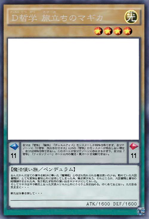 | 自分は「哲学」「徹学」「デュエルアイズ」モンスターしか特殊召喚できず、自分Pゾーンに「D哲学 旅立ちのマギカ」以外の「哲学」Dモンスターが存在しない場合、自分は特殊召喚できない。このカードが自分Pゾーンに存在するかぎり、自分は「哲学」「フィロソフィー」カード以外の魔法・罠カードを発動できない。 | |||