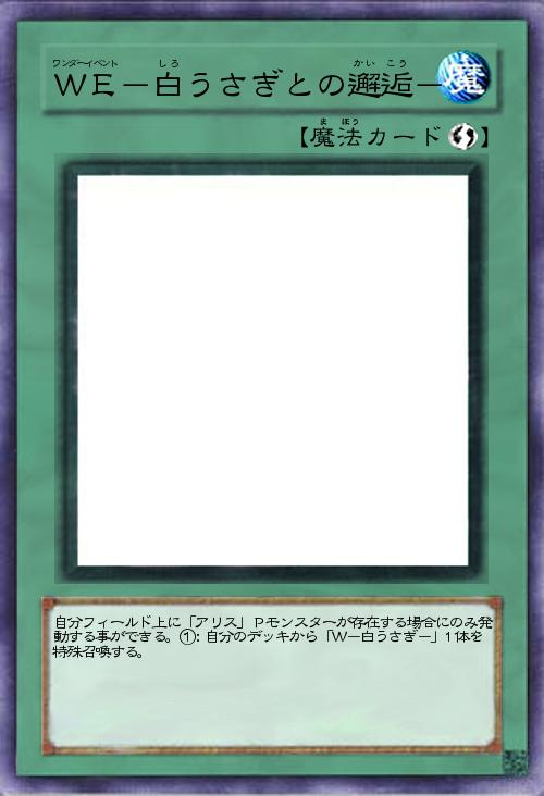 | 自分フィールド上に「アリス」Pモンスターが存在する場合にのみ発動する事ができる。①:自分のデッキから「W-白うさぎ-」1体を特殊召喚する。 | |||