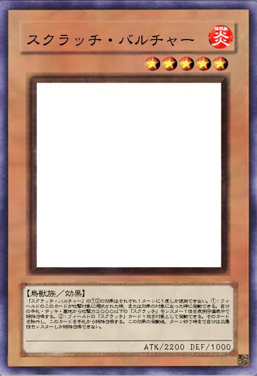 | 「スクラッチ・バルチャー」の①②の効果はそれぞれ1ターンに1度しか使用できない。①:フィールドのこのカードが攻撃対象に選択された時、または効果の対象になった時に発動できる。自分の手札・デッキ・墓地から攻撃力2000以下の「スクラッチ」モンスター1体を表側守備表示で特殊召喚する。②:フィールドの「スクラッチ」カード1枚を対象として発動できる。そのカードを除外し、このカードを手札から特殊召喚する。この効果の発動後、ターン終了時まで自分は炎属性モンスターしか特殊召喚できない。 | |||