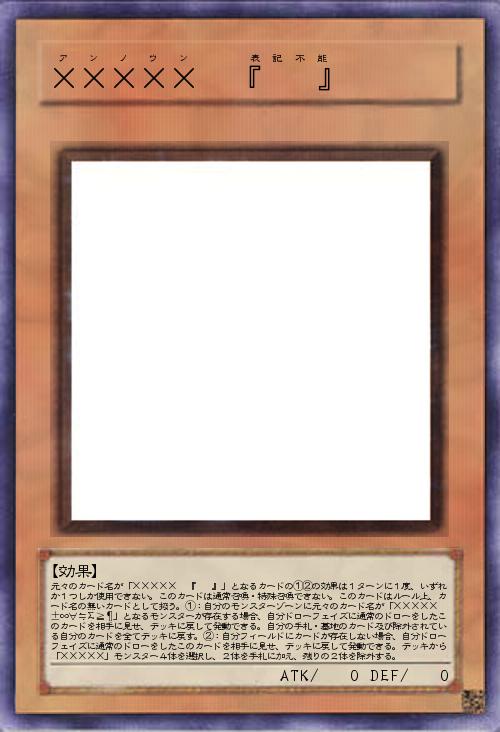 | 元々のカード名が「××××× 『 』」となるカードの①②の効果は1ターンに1度、いずれか1つしか使用できない。このカードは通常召喚・特殊召喚できない。このカードはルール上、カード名の無いカードとして扱う。①:自分のモンスターゾーンに元々のカード名が「××××× ±∞∀≒Σ≧¶」となるモンスターが存在する場合、自分ドローフェイズに通常のドローをしたこのカードを相手に見せ、デッキに戻して発動できる。自分の手札・墓地のカード及び除外されている自分のカードを全てデッキに戻す。②:自分フィールドにカードが存在しない場合、自分ドローフェイズに通常のドローをしたこのカードを相手に見せ、デッキに戻して発動できる。デッキから「×××××」モンスター4体を選択し、2体を手札に加え、残りの2体を除外する。 | |||