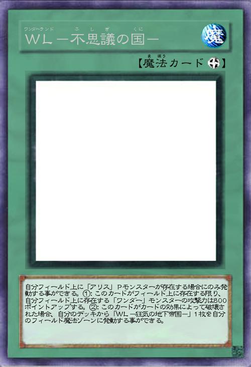 | 自分フィールド上に「アリス」Pモンスターが存在する場合にのみ発動する事ができる。①:このカードがフィールド上に存在する限り、自分フィールド上に存在する「ワンダー」モンスターの攻撃力は800ポイントアップする。②:このカードがカードの効果によって破壊された場合、自分のデッキから「WL-狂気の地下帝国-」1枚を自分のフィールド魔法ゾーンに発動する事ができる。 | |||