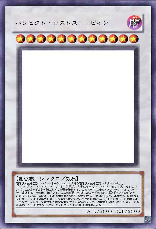 | 闇属性・昆虫族チューナー2体+チューナー以外の闇属性・昆虫族モンスター2体以上 「パラセクト・ロストスコーピオン」の①②③の効果はそれぞれ1ターンに1度しか使用できない。①:このカードがS召喚に成功した場合発動する。このカード以外の自分フィールド上のカード全て破壊する。その後、相手ライフにこの効果で破壊したカードの枚数×200ポイントのダメージを与える。②:このカードが破壊された場合、発動できる。自分のデッキ、墓地から「パラセクト」カード又は「異怪虫」カードを合計4枚まで選んで手札に加える。③:このカードの戦闘によって相手モンスターを破壊した場合発動できる。自分のデッキ、墓地から破壊したモンスターのレベル又はランク以下の「パラセクト」モンスター1体を特殊召喚する。 | |||