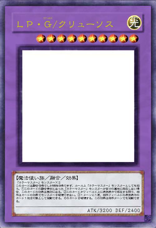 | 「カラーマスター」モンスター×2 このカードは融合召喚でしか特殊召喚できず、ルール上「カラーマスター」モンスターとしても扱う。①このカードの融合素材となった「カラーマスター」モンスターが自分の墓地に存在しない場合、このカードの効果は無効になる。②このカードがフィールド上に表側表示で存在する限り、相手はカードの効果でモンスターを破壊できない。③1ターンに1度、相手フィールドの表側表示のカード1枚を対象として発動できる。そのカードを破壊する。この効果は相手ターンでも発動できる。 | |||