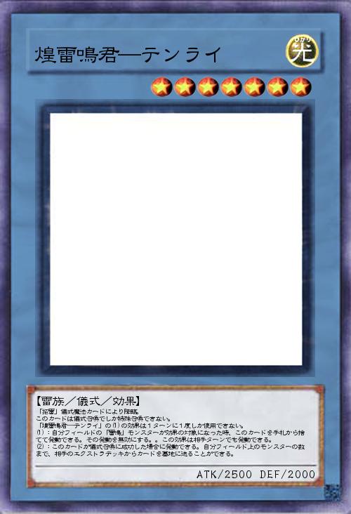 | 「招雷」儀式魔法カードにより降臨。 このカードは儀式召喚でしか特殊召喚できない。 「煌雷鳴君―テンライ」の(1)の効果は1ターンに1度しか使用できない。 (1):自分フィールドの「雷鳴」モンスターが効果の対象になった時、このカードを手札から捨てて発動できる。その発動を無効にする。。この効果は相手ターンでも発動できる。 (2):このカードが儀式召喚に成功した場合に発動できる。自分フィールド上のモンスターの数まで、相手のエクストラデッキからカードを墓地に送ることができる。 | |||