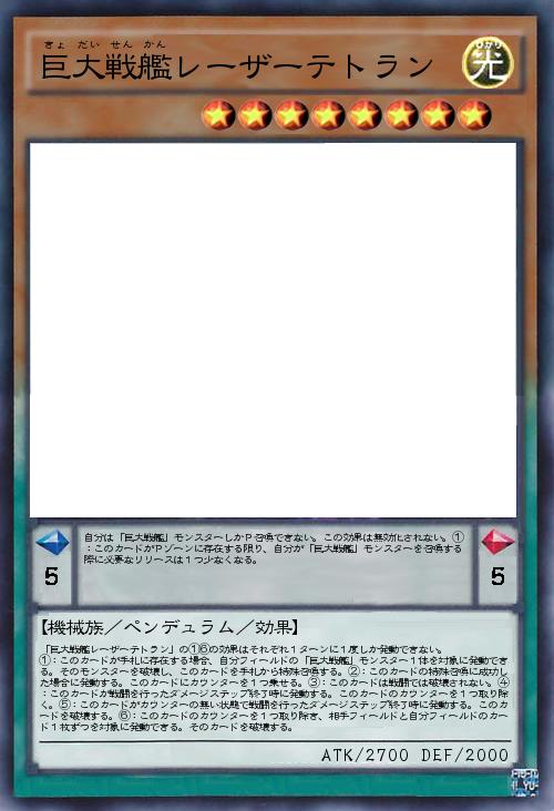 | 「巨大戦艦レーザーテトラン」の①⑥の効果はそれぞれ1ターンに1度しか発動できない。 ①:このカードが手札に存在する場合、自分フィールドの「巨大戦艦」モンスター1体を対象に発動できる。そのモンスターを破壊し、このカードを手札から特殊召喚する。②:このカードの特殊召喚に成功した場合に発動する。このカードにカウンターを1つ乗せる。③:このカードは戦闘では破壊されない。④:このカードが戦闘を行ったダメージステップ終了時に発動する。このカードのカウンターを1つ取り除く。⑤:このカードがカウンターの無い状態で戦闘を行ったダメージステップ終了時に発動する。このカードを破壊する。⑥:このカードのカウンターを1つ取り除き、相手フィールドと自分フィールドのカード1枚ずつを対象に発動できる。そのカードを破壊する。 | |||