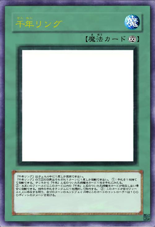| 「千年リング」はデュエル中に1度しか使用できない。 「千年リング」の①②の効果はそれぞれ1ターンに1度しか発動できない。 ①:手札を1枚捨てて発動できる。デッキから「千年」と名のついた永続魔法カード1枚を手札に加える。 ②:お互いのフィールドにこのカード以外の「千年」と名のついた永続魔法カードが存在しない場合に発動できる。相手の手札をランダムに1枚選択して除外する。 ③:このカードが自分フィールド上に存在する限り、自分のターンのエンドフェイズ時にこのカードのコントローラーは1000ポイントのダメージを受ける。 | |||