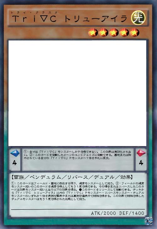| ①:このカードはフィールド・墓地に存在する限り、通常モンスターとして扱う。②:フィールドの通常モンスター扱いのこのカードを通常召喚としてもう1度召喚できる。その場合またはリバースしたこのカードは効果モンスター扱いとなり以下の効果を得る。●このカードをリリースして発動できる。デッキから「Tri▽C トリューアイラ」以外の「Tri▽C」Pモンスター・リバースモンスター・デュアルモンスターのいずれか1体を表側攻撃表示または裏側守備表示で特殊召喚する。この効果で特殊召喚したデュアルモンスターはもう1度召喚された状態として扱う。 | |||