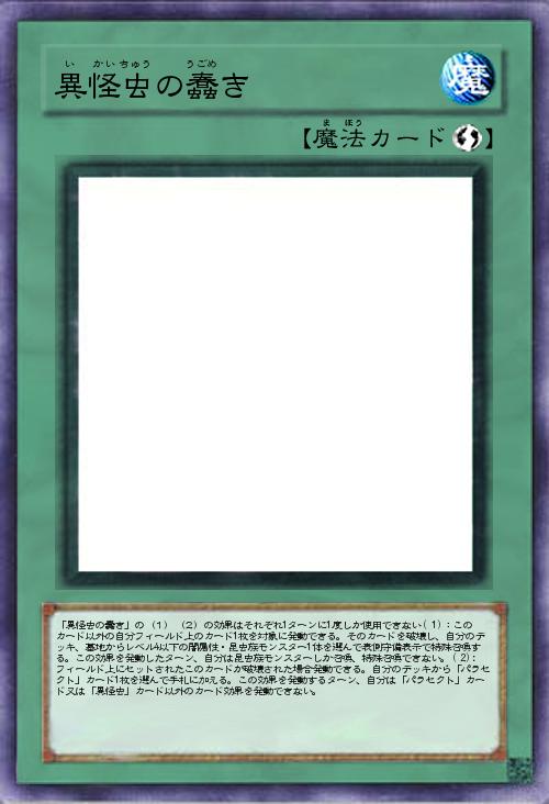 | 「異怪虫の蠢き」の(1)(2)の効果はそれぞれ1ターンに1度しか使用できない( 1):このカード以外の自分フィールド上のカード1枚を対象に発動できる。そのカードを破壊し、自分のデッキ、墓地からレベル4以下の闇属性・昆虫族モンスター1体を選んで表側守備表示で特殊召喚する。この効果を発動したターン、自分は昆虫族モンスターしか召喚、特殊召喚できない。( 2):フィールド上にセットされたこのカードが破壊された場合発動できる。自分のデッキから「パラセクト」カード1枚を選んで手札に加える。この効果を発動するターン、自分は「パラセクト」カード又は「異怪虫」カード以外のカード効果を発動できない。 | |||