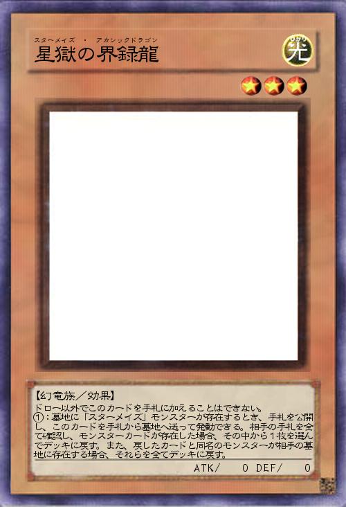 | ドロー以外でこのカードを手札に加えることはできない。 ①:墓地に「スターメイズ」モンスターが存在するとき、手札を公開し、このカードを手札から墓地へ送って発動できる。相手の手札を全て確認し、モンスターカードが存在した場合、その中から1枚を選んでデッキに戻す。また、戻したカードと同名のモンスターが相手の墓地に存在する場合、それらを全てデッキに戻す。 | |||