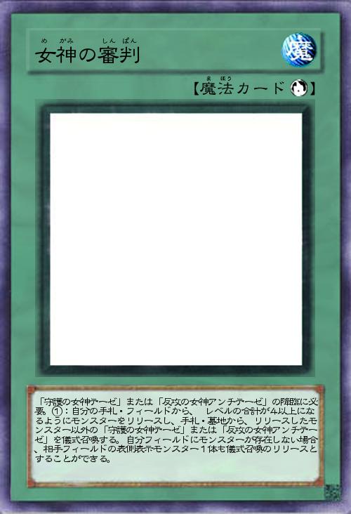 | 「守護の女神テーゼ」または「反攻の女神アンチテーゼ」の降臨に必要。①:自分の手札・フィールドから、 レベルの合計が4以上になるようにモンスターをリリースし、手札・墓地から、リリースしたモンスター以外の「守護の女神テーゼ」または「反攻の女神アンチテーゼ」を儀式召喚する。自分フィールドにモンスターが存在しない場合、相手フィールドの表側表示モンスター1体も儀式召喚のリリースとすることができる。 | |||