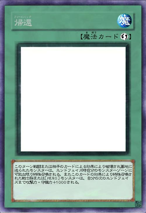 | このターン戦闘または相手のカードによる効果により破壊され墓地に送られたモンスターは、エンドフェイズ時自分のモンスターゾーンに可能な限り特殊召喚される。またこのカードの効果により特殊召喚された戦士族または[HERO]モンスターは、自分の次のエンドフェイズまで攻撃力・守備力+1000される。 | |||