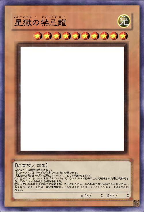 | このカードは通常召喚できない。 「スターメイズ」カードの効果でのみ特殊召喚できる。 「星獄の禁忌龍」の②の効果は1ターンに1度しか発動できない。 ①:自分のコントロールする「スターメイズ」モンスターが相手によって破壊された場合発動できる。このカードを手札から特殊召喚する。 ②:お互いの手札を全て捨てて発動する。それぞれこのカードの効果で自分が捨てた枚数分のカードをドローする。その後、自分は墓地のレベル7以上の「スターメイズ」モンスター1体を手札に加える。 | |||