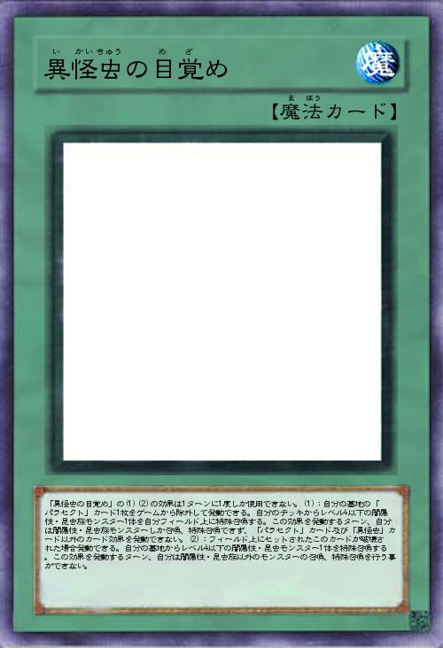 | 「異怪虫の目覚め」の(1)(2)の効果は1ターンに1度しか使用できない。(1):自分の墓地の「パラセクト」カード1枚をゲームから除外して発動できる。自分のデッキからレベル4以下の闇属性・昆虫族モンスター1体を自分フィールド上に特殊召喚する。この効果を発動するターン、自分は闇属性・昆虫族モンスターしか召喚、特殊召喚できず、「パラセクト」カード及び「異怪虫」カード以外のカード効果を発動できない。(2):フィールド上にセットされたこのカードが破壊された場合発動できる。自分の墓地からレベル4以下の闇属性・昆虫モンスター1体を特殊召喚する。この効果を発動するターン、自分は闇属性・昆虫族以外のモンスターの召喚、特殊召喚を行う事ができない。 | |||