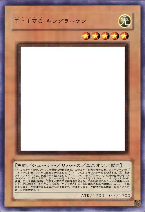 | ①:このカードがリバースした場合に発動できる。このカードを含む自分のモンスターゾーンの「Tri▽C」モンスター2体をS素材として「Tri▽C」SモンスターをS召喚する。②:自分メインフェイズ1度、装備カード扱いとして「Tri▽C キングラーケン」以外の自分のモンスターゾーンの「Tri▽C」チューナーモンスター・リバースモンスター・ユニオンモンスターに装備、または装備を解除して表側攻撃表示で特殊召喚できる。この効果でこのカードが装備カードとなっている限り、自分フィールドの「Tri▽C」カードは相手の効果で破壊されない。(1体のモンスターが装備できるユニオンは1枚まで。装備モンスターが破壊される場合、代わりにこのカードを破壊する。) | |||