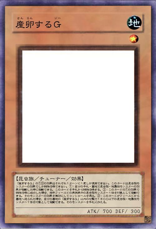 | 「産卵するG」の①③の効果はそれぞれ1ターンに1度しか使用できない。このカードは昆虫族モンスターの効果でしか特殊召喚できない。①:自分の手札・墓地で昆虫族・地属性モンスターの効果が発動した時に発動できる。このカードを手札から特殊召喚する。②:このカードの①の効果で特殊召喚に成功した場合、相手フィールドの表側表示の昆虫族モンスター1体を対象として発動できる。そのモンスターの効果を無効にしてコントロールを得る。③:このカードがフィールドから墓地へ送られた場合、自分の墓地の「産卵するG」以外の攻撃力1500以下の昆虫族・地属性モンスター1体を対象として発動できる。そのモンスターを手札に加える。 | |||