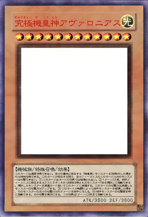 | このカードは通常召喚できない。自分の墓地に存在する「機皇帝」モンスターを3体除外した場合のみ特殊召喚できる。このカードが存在する限り、自分フィールド上のこのカード以外のモンスターは攻撃できない。①:このカードはカードの効果では破壊されない。②:1ターンに1度、相手フィールド上に存在するエクストラデッキから特殊召喚されたモンスター1体を選択して発動できる。選択したモンスターを装備カード扱いでこのカードに装備する。このカードの攻撃力は装備したモンスターの攻撃力分アップする。③:このカードが戦闘によって相手モンスターを破壊した場合、そのモンスターの元々の攻撃力分のダメージを相手に与える。④:相手モンスターの攻撃宣言時に発動できる。その攻撃を無効にする。この効果は1ターンに3回まで発動できる。 | |||